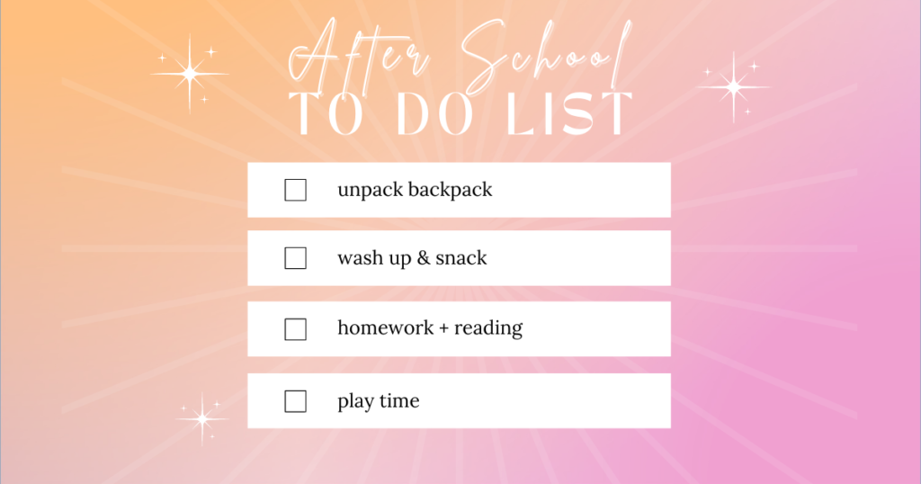 Now that routine has been set for your morning time, think about setting a routine for the afternoon so your kids know what is expected. It’s always nice to know what you’re doing when you get home, my kids don’t complain anymore on the way home from school that they are starving because they know the first thing they can do is have a snack. I like to say one fruit and one item from the pantry, so if it’s a bag of pretzels and a small apple I know they will be sustained until dinner. Here’s a look at our afternoons (if we don’t have an activity right after school.)