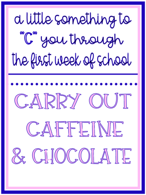 This year I’m thinking of how hectic that first week of school can be and THIS idea from Lisa over at Over The Big Moon is BRILLIANT! I actually got this (from a teacher kid) a few years ago and it was the sweetest, most thoughtful idea because I definitely needed those 3 c’s. I recreated the tag and you’re welcome to download it for yourself by clicking the image below.