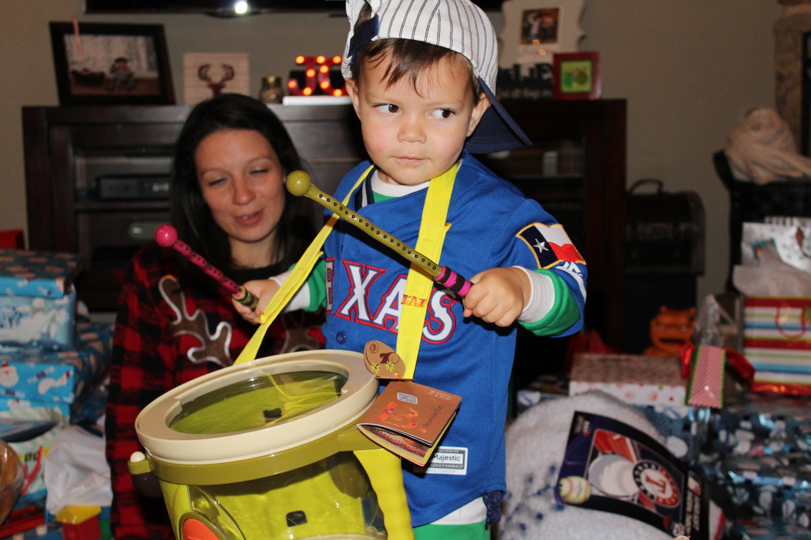 Cowboys jersey, Rangers jersey, baseball cap and playing the drums. Can he stay this way forever??