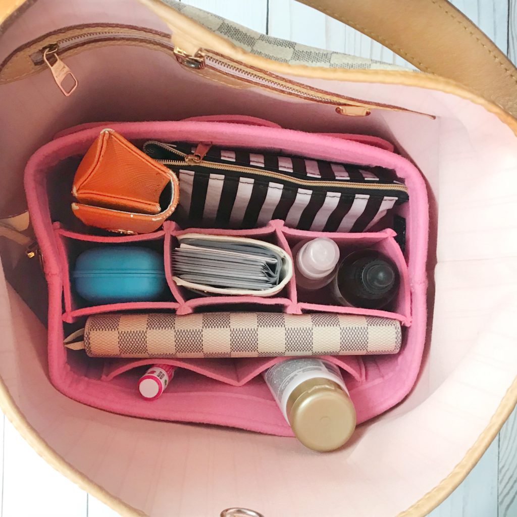 I don’t know about you but my purse is ALWAYS a mess. No matter how many times I clean it out and reorganize it, the mess always returns, am I right moms? Cue this handbag organizer. I absolutely love the pretty color and it matches the inside of my bag. It is sturdy enough to give your bag some structure but light enough so it doesn’t weigh it down. I also love that it has an insert that is optional. There are three sizes and I got a small, here’s what it looks like in my purse.