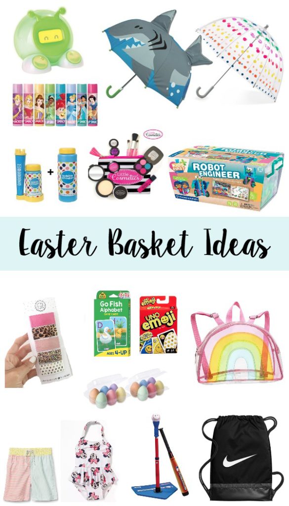 Basket Liners Pottery Barn Kids / Swimsuits Boys trunks & girls Minnie suit / Clear Rainbow backpack: Here / Nike Gym Sack: Here / Disney Princess Chapstick / Leather Snap Clips: Ryan and Wren / Best Bubbles Ever- Gymboree Bubbles / Egg shaped sidewalk chalk / Uno Game Cards / Go Fish Alphabet Game / Umbrella polka dot / Umbrella Shark / Robot Engineer Kit / Little Cosmetics Pretend Make up / OK to Wake Alarm Clock / Adjustable T Ball Set
