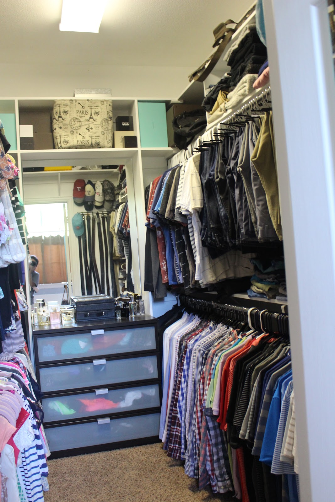 He built two rows on each side for each of our clothes and created that center section for our dresser and a vanity mirror.