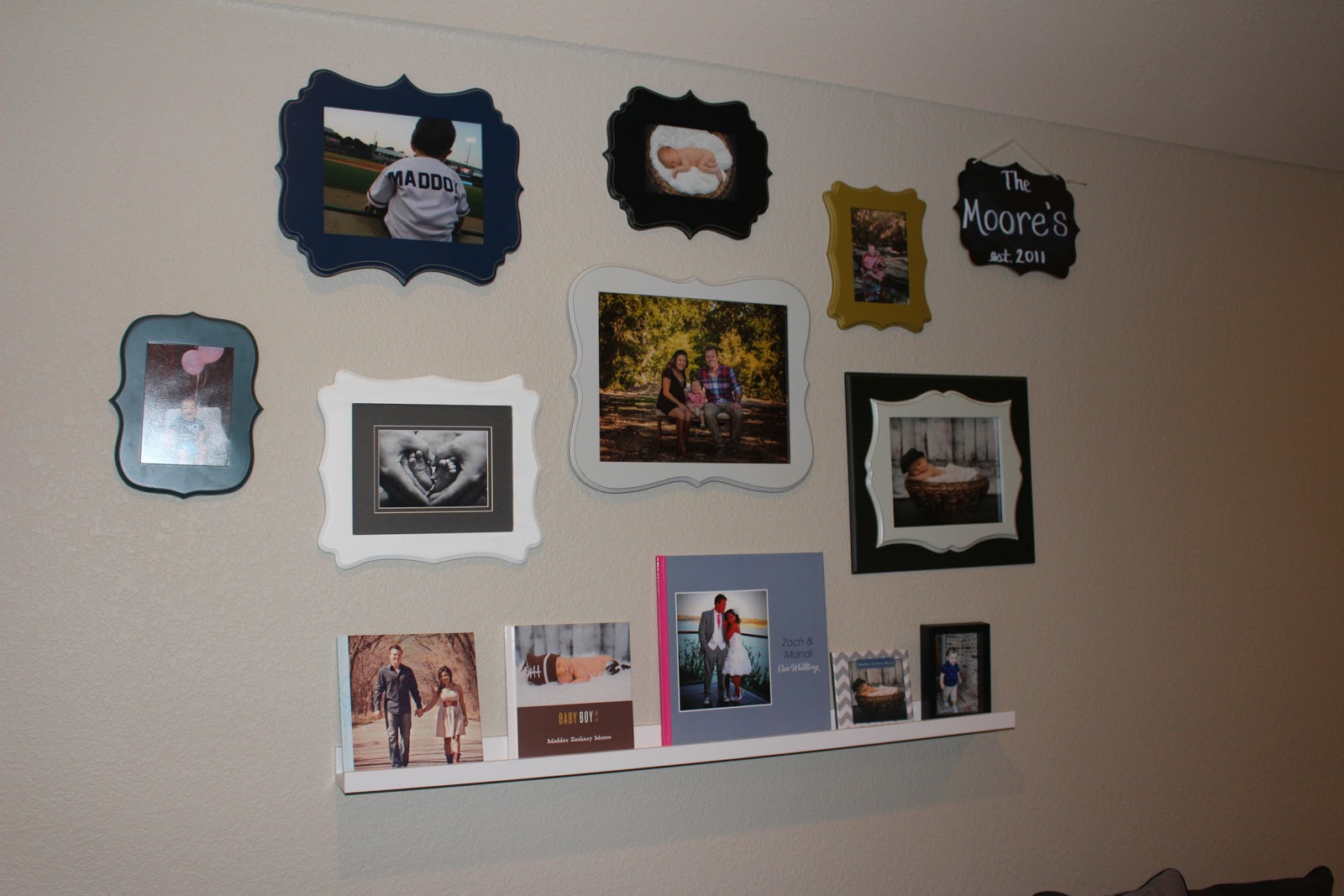 This is my only form of adult decoration in this room. I wanted to give it a “homey” feel with photos of our family. The frames are mostly from Hobby Lobby and the book ledge is from Ikea.