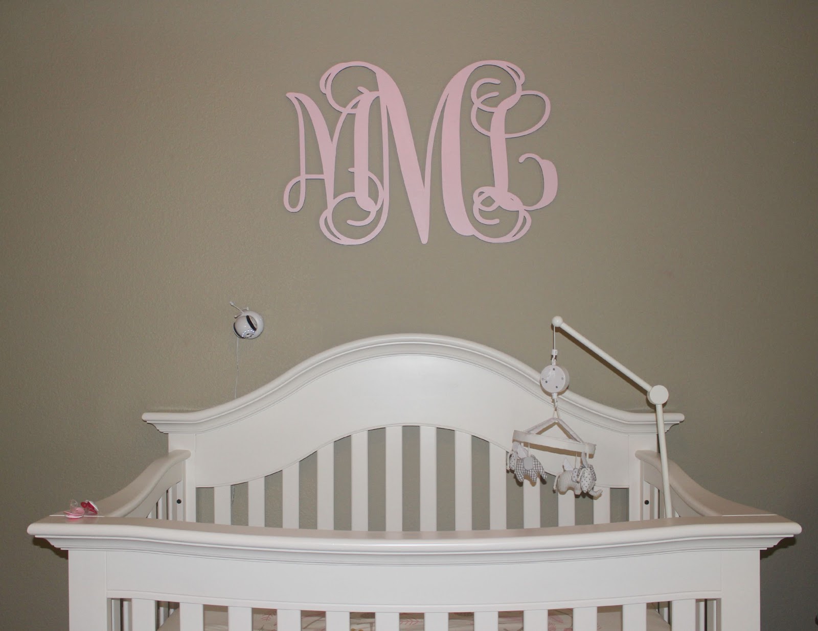 I really love the monogram wood sign above her crib we painted it pink and it adds the perfect touch.