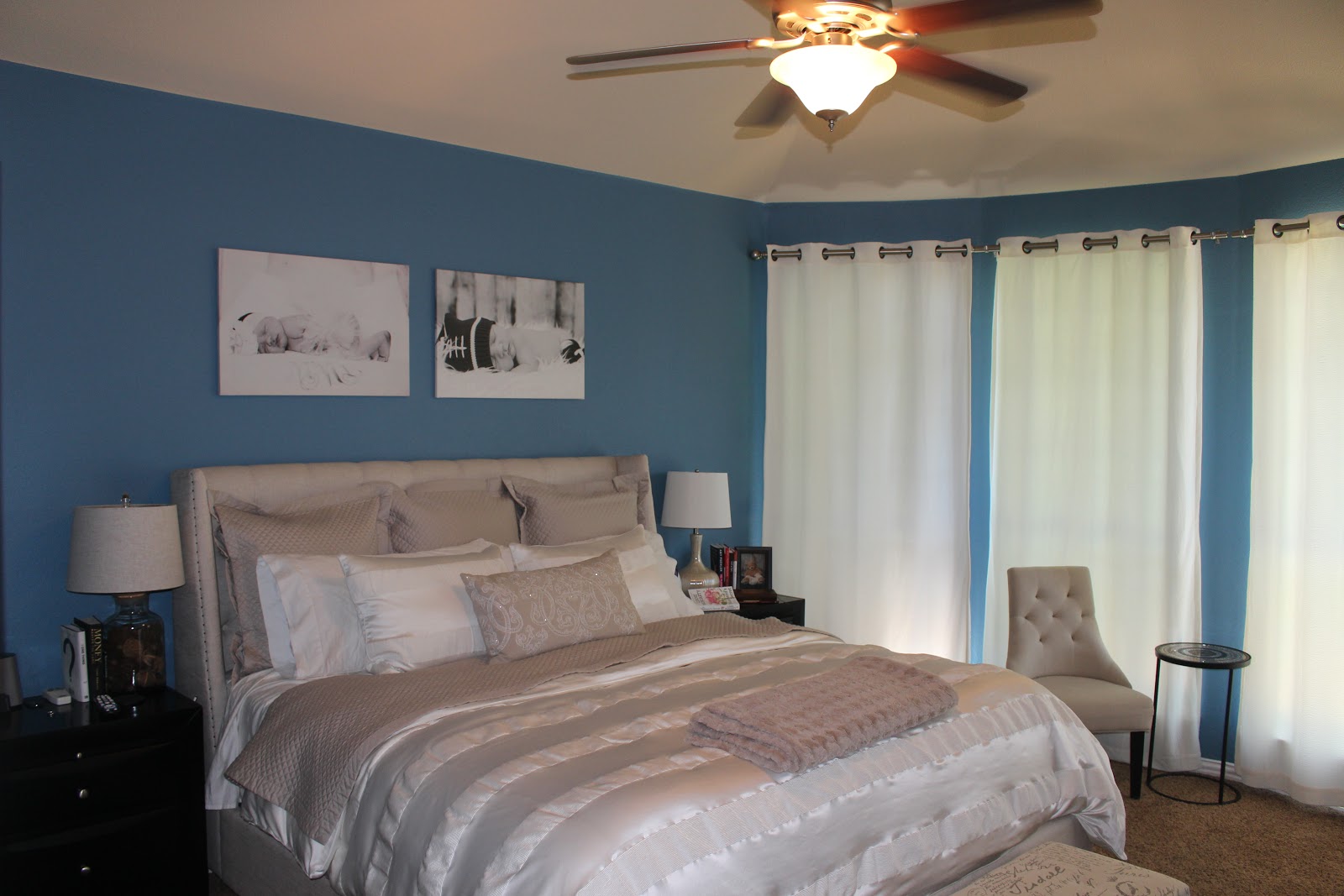 Moving on to our Master bedroom, we decided to go with a light blue color for the walls and white/beige for the decor.