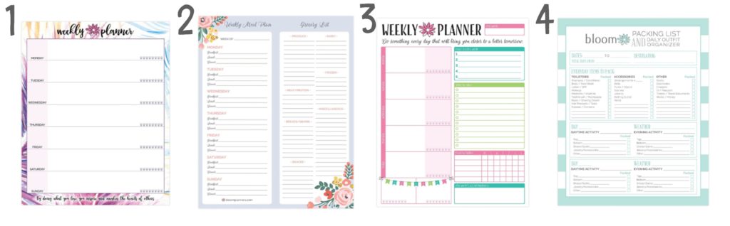 1. Weekly Planner / 2. Meal/Grocery Planner / 3. Weekly Planner / 4. Packing List